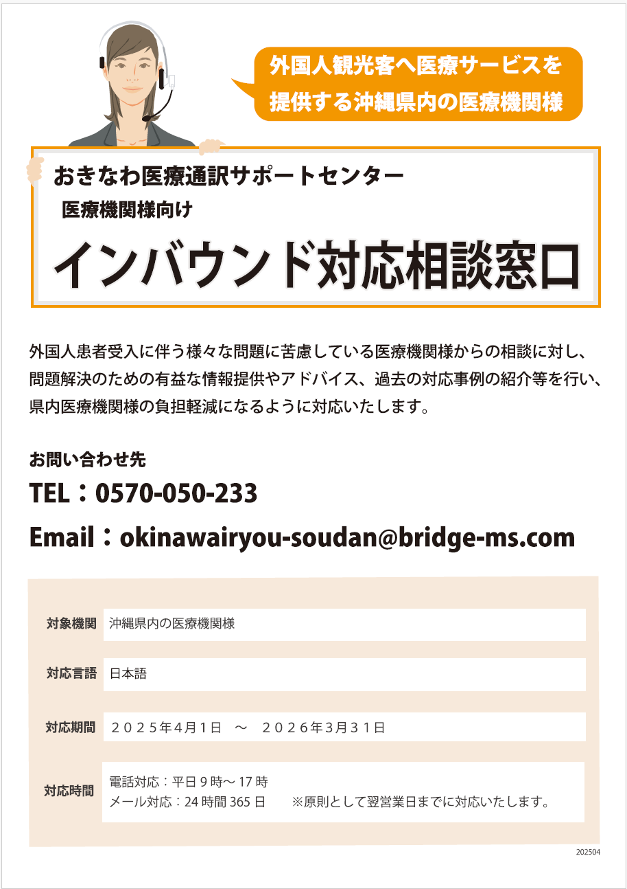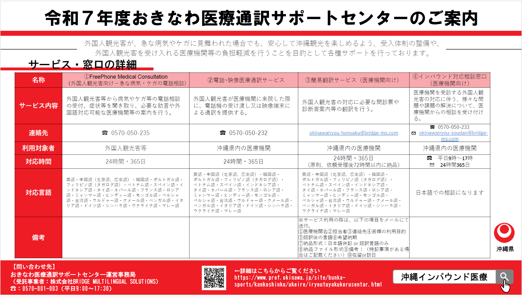 外国人観光客が急な病気やケガに見舞われた場合でも、安心して沖縄観光を楽しめるよう、受入体制の整備や、外国人観光客を受け入れる医療機関等の負担軽減を行うことを目的に、外国人観光客からの電話相談や医療機関からの電話通訳依頼等に応じるインバウンド医療対応多言語コールセンター事業を実施しています。