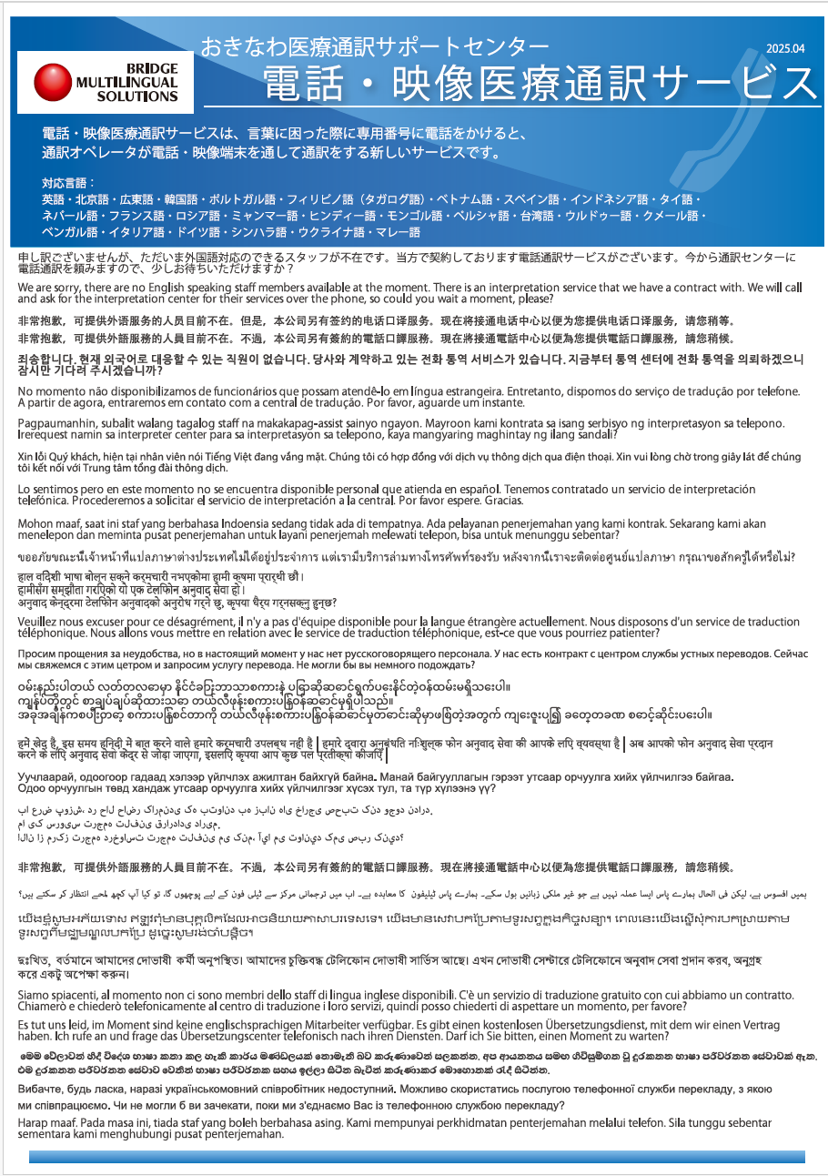 英語・中国語(北京語、広東語)・韓国語・ポルトガル語・フィリピノ語(タガログ語)・ベトナム語・スペイン語・インドネシア語・タイ語・ネパール語・フランス語・ロシア語・ミャンマー語・ヒンディー語・モンゴル語・ペルシャ語・台湾語・ウルドゥー語・クメール語・ベンガル語・イタリア語・ドイツ語・シンハラ語・ウクライナ語・マレー語(全26言語)