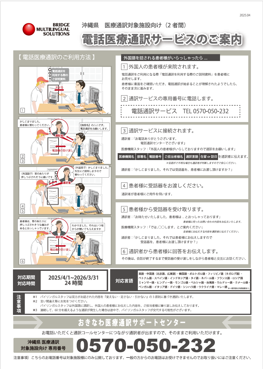 医療機関に来院の外国人観光客対応のため、電話機の受け渡し又は映像端末による通訳提供する。