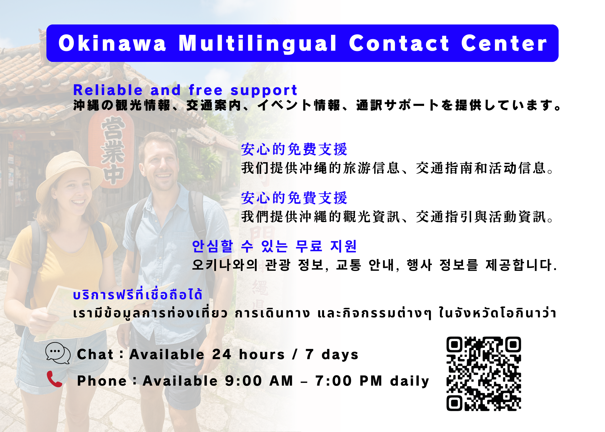 沖縄の観光案内、旅程相談、通訳、台風・災害時など、外国新観光客からの問合わせに対応致します。