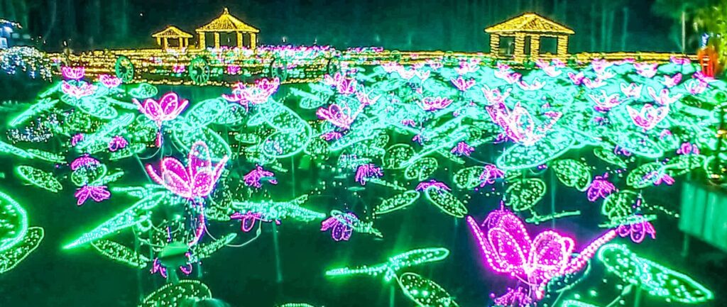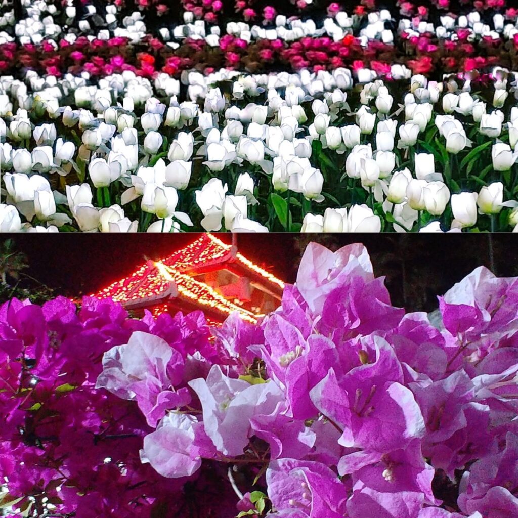 ブーゲンビリアと光のチューリップ、水面を覆う光の蓮の花は幻想的です。